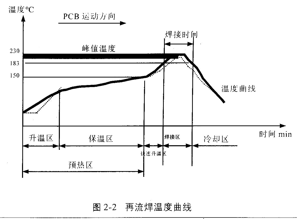 從溫度曲線(見圖2-2)分析再流焊的原理:當(dāng)PCB進(jìn)入升溫區(qū)(干燥區(qū))時(shí),焊膏中的溶劑、氣體蒸發(fā)掉,同時(shí),焊膏中的助焊劑潤濕焊盤、元器件端頭和引腳,焊膏軟化、塌落、覆蓋了焊盤、元器件端頭和引腳與氧氣隔離→PCB進(jìn)入保溫區(qū)時(shí),PCB和元器件得到充分的預(yù)熱,以防PCB突然進(jìn)入焊接高溫區(qū)而損壞PCB和元器件→當(dāng)PCB進(jìn)入焊接區(qū)時(shí),溫度迅速上升使焊膏達(dá)到熔化狀態(tài),液態(tài)焊錫對PCB的焊盤、元器件端頭和引腳潤濕、擴(kuò)散、漫流或回流混合形成焊錫接點(diǎn)→PCB進(jìn)入冷卻區(qū),使焊點(diǎn)凝固。此時(shí)完成了再流焊。